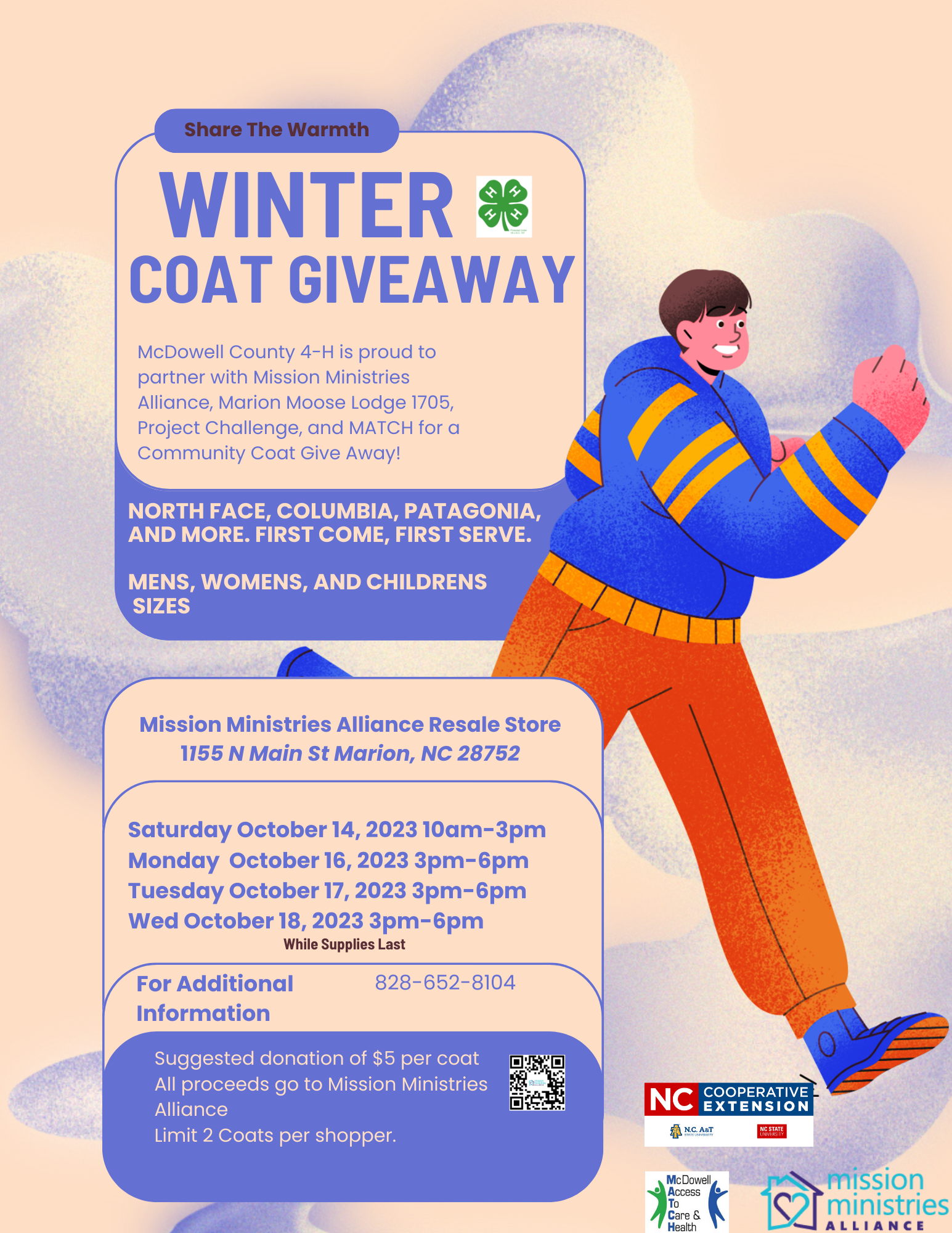 McDowell County 4-H has partnered with MATCH, Mission Ministries Alliance, Project Challenge and the Marion Moose Lodge to hold a Coat Distribution. We have lots of coats in youth sizes and men's and women's. Many styles and brands including Patagonia, North Face, Columbia and many more.