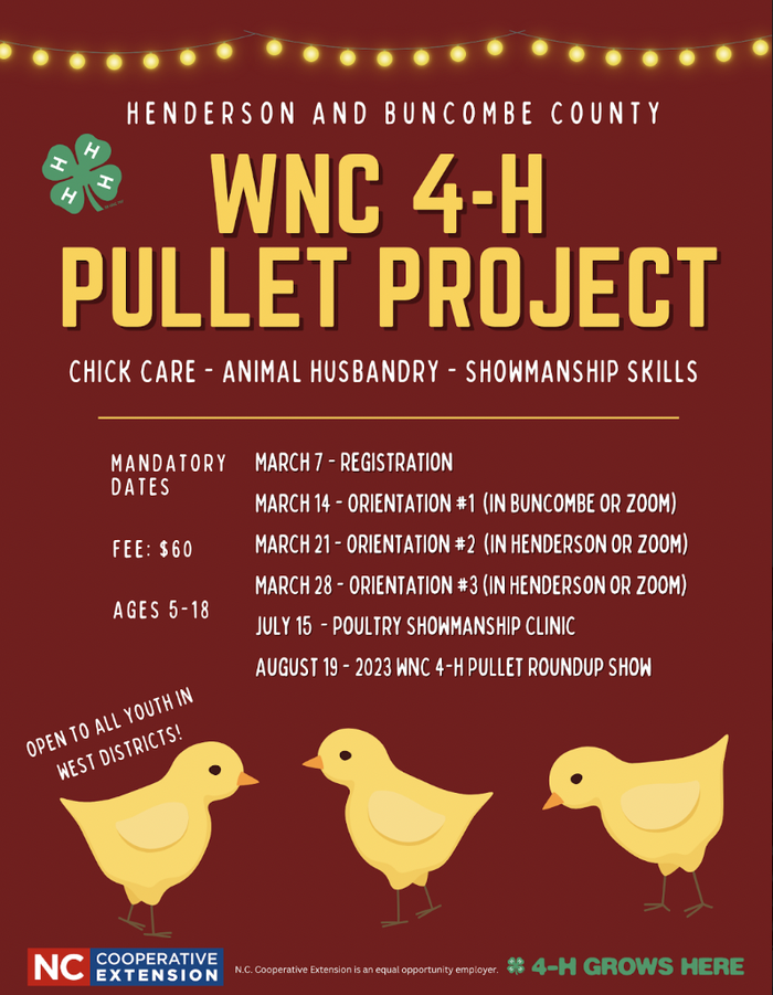 We are excited to offer an opportunity to youth in McDowell County to raise their own egg laying chickens. Through a partnership with Henderson and Buncombe counties the WNC Pullet Project is seeking youth. Youth will receive 5 birds and will learn how to care for them, raise them and show them. All at a low cost for the youth. If you are interested please let Chad or Skyler know by calling 652-8104. Some scholarships may be available.